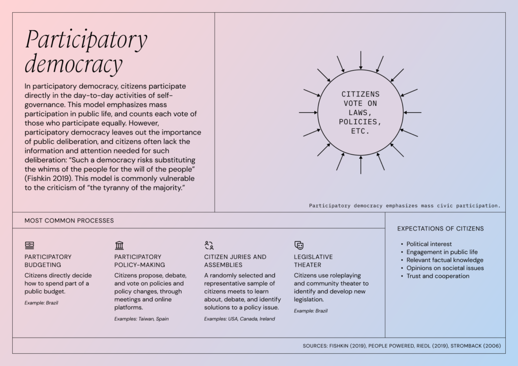 Participatory democracy is a model where citizens have direct participation in the daily activities of self-governance. The media and journalists play the role of motivating and mobilizing political interests, civic participation, and self-expression. This model emphasizes mass participation in public life and counts each vote equally. However, participatory democracy leaves out the importance of public deliberation, and citizens often lack the necessary information and attention for such deliberation. This may result in substituting the whims of the people for the will of the people. This model is susceptible to the criticism of “the tyranny of the majority.”