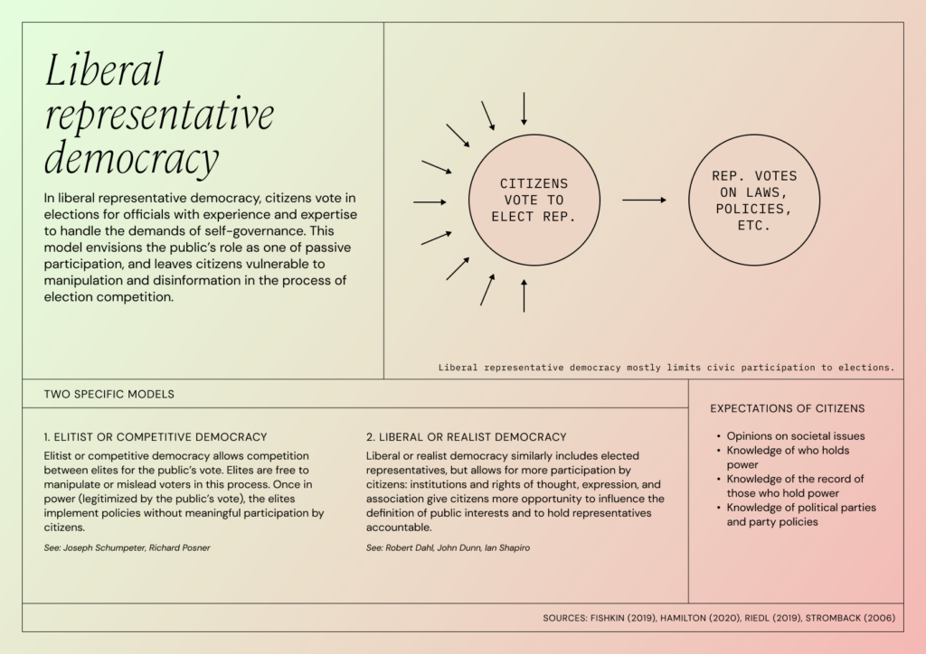 Liberal representative democracy involves citizens voting in elections for officials with experience and expertise to handle self-governance. The media and journalists act as neutral facilitators between these officials and the public. Specific models within this include elitist or competitive democracy, which allows elites to compete for the public’s vote and to implement policies without meaningful citizen participation, and liberal or realist democracy, which allows for more participation by citizens but still leaves them vulnerable to manipulation and disinformation during election competition. Both models view the public’s role as one of detached participation in governance.