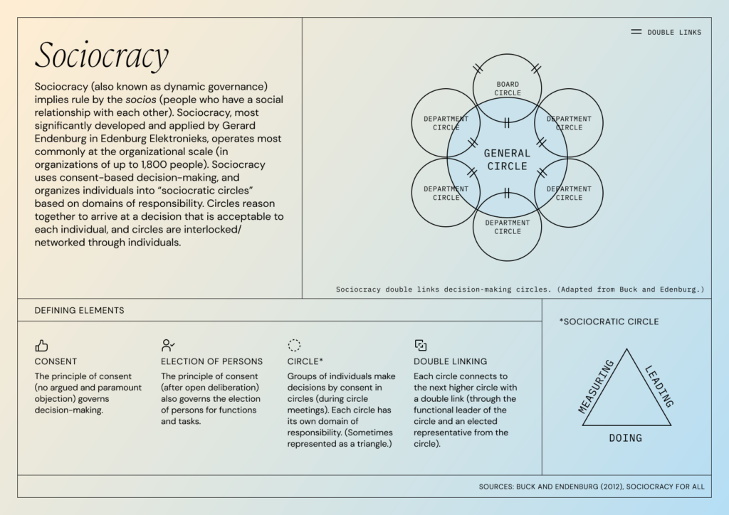 Lastly, let’s consider sociocracy, an alternative governance model for cooperatives, most