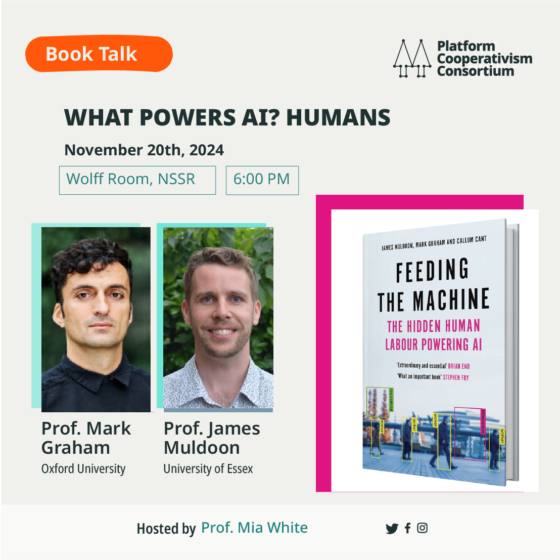 Join us, in person (!), to explore Feeding the Machine: The Hidden Human Labour Powering AI, an exposé by James Muldoon, Mark Graham, and Callum Cant. This new book looks beyond the facade of slick artificial intelligence services to reveal the invisible labor, real lives, and challenging conditions behind the algorithms that shape our world. Brace yourself for a candid talk that probes the true impact of AI on human lives, questioning what we trade for technological gains. The talk will be hosted by Prof. Mia White.