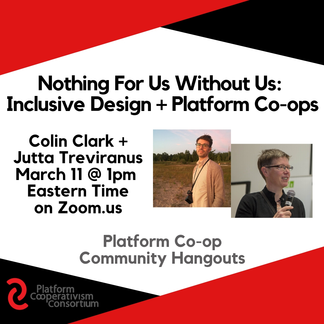 A big thank you to the Inclusive Design Research Centre team in Canada who joined us for a community hangout focusing on how inclusive design can inform platform co-ops, and a special thank you to Colin Clark and Jutta Treviranus for preparing comments.